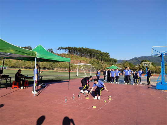 接着,素质拓展活动正式开始。本次活动设置了接力五子棋、背部传画、企鹅漫步、不倒森林、奔跑吧“接力大赛”等多个趣味游戏项目。在接力五子棋比赛中,各队队员紧密配合,在紧张刺激的氛围里斗智斗勇,展现出了出色的策略思维和团队协作能力;背部传画环节,队员们通过独特的方式传递信息,过程中充满了欢声笑语,考验了团队间的默契程度;企鹅漫步比赛里,参赛同学化身可爱的“企鹅”,小心翼翼地夹球前行,憨态可掬的模样引得现场观众阵阵欢笑;不倒森林项目中,同学们全神贯注,保持高度的专注力和协调能力,努力让手中的PVC管不倒;奔跑吧“接力大赛”则将活动气氛推向高潮,选手们全力冲刺,为团队荣誉而战,展现出了青春的活力与激情。