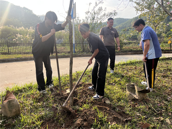 常务副校长李刚副教授、德育副校长林文丰副教授、学生科科长邓定钊等人参加此次植树活动。师生一行在孔子广场集合,扛上劳作用具,踏着春光前往植树区。现场师生或挥锹铲土、或扶苗填坑,大家默契配合,汗水浸透衣背,却掩不住脸上的喜悦。每一棵新栽的树苗,都承载着对未来的期许,象征着雷锋精神的传承与发扬。