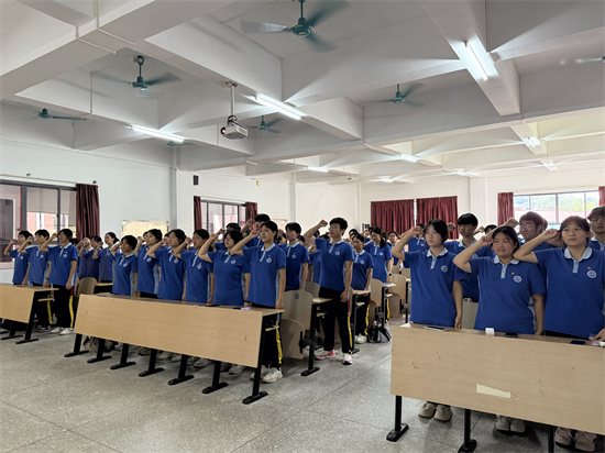 仪式在激昂的中华人民共和国国歌声中正式拉开帷幕。全体人员肃立,目光庄重地注视着前方,歌声嘹亮,回荡在教室的每一个角落。那激昂的旋律,仿佛是历史的回响,激励着新团员们铭记国家的奋斗历程;那坚定的歌声,彰显着他们对祖国的无限热爱和崇高敬意,也为这场意义非凡的仪式奠定了庄严而神圣的基调。