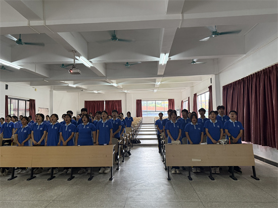 仪式在激昂的中华人民共和国国歌声中正式拉开帷幕。全体人员肃立,目光庄重地注视着前方,歌声嘹亮,回荡在教室的每一个角落。那激昂的旋律,仿佛是历史的回响,激励着新团员们铭记国家的奋斗历程;那坚定的歌声,彰显着他们对祖国的无限热爱和崇高敬意,也为这场意义非凡的仪式奠定了庄严而神圣的基调。
