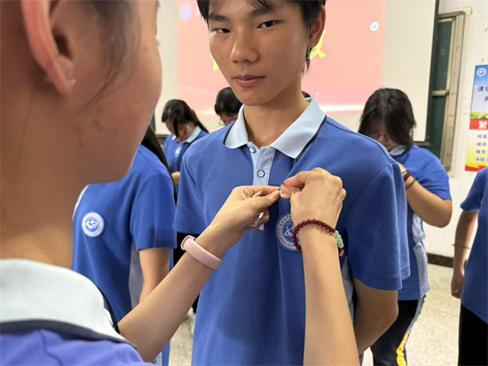 佩戴团徽环节将仪式推向了高潮。23 级优秀团员代表张雅婷、曾雅姿、钟孝宜分三批为新团员佩戴团徽。当那闪耀着光芒的团徽被轻轻别在胸前,新团员们的脸上瞬间绽放出灿烂而自豪的笑容。这小小的团徽,不仅是一份荣誉的象征,更是一份沉甸甸的责任与使命,它激励着新团员们在今后的学习和生活中,以更高的标准要求自己,努力成为有理想、敢担当、能吃苦、肯奋斗的新时代好青年。