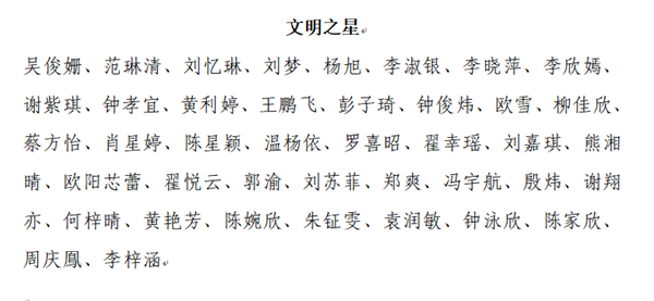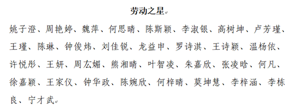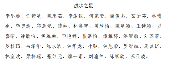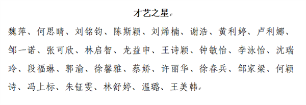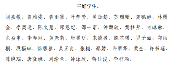 根据《惠州市华磐职业技术学校优秀学生评选办法》,经学生本人所在班级提名,年级组初评推荐,学生科结合学生在校期间的综合表现,确定刘嘉敏等29名同学为我校“三好学生”;刘铭靓等29名同学为我校“优秀班干部”;刘铭钧等18名同学为我校“语文学习之星”;刘铭钧等22名同学为我校“数学学习之星”;梁钰莹等25名同学为我校“英语学习之星”;邓珍珍等18名同学为我校“专业课学习之星”;李思璇等38名同学为我校“进步之星”;吴俊姗等41名同学为我校“文明之星”;魏萍等29名同学为我校“才艺之星”;姚子澄等33名同学为我校“劳动之星”;张慧莉等29名同学为我校“体育之星”候选人,现予以公示。